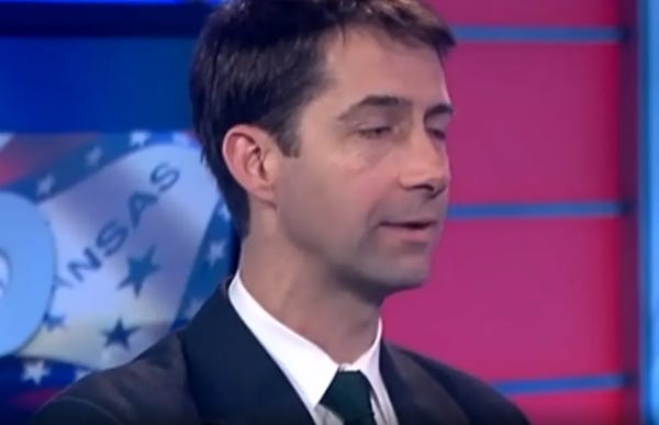 This is a guy who sent cease and desist letters to somebody's Nana in 2017, because she kept calling his office , like he was the senator from Arkansas or something. This is a guy who was mercilessly mocked by Obama White House Press Secretary (remember when we had those?) Josh Earnest, calling him an "international man of mystery" for his super top secret Inspector Gadget detective work exposing the nefarious dark sides of Obama's nuclear deal with Iran. Another time, Earnest made fun of Cotton for working above his paygrade to subvert the nuke deal (because Cotton thought he, and not Obama, was in charge of setting Obama foreign policy), saying Cotton should probably go away, little boy, because he was pretty sure Cotton "couldn't differentiate heavy water from sparkling water." (Nuclear jokes, GET SOME!) Cotton responded by tweeting WOCKA WOCKA I NEVER DUN' DRINK NO GAY SPARKLE WATER WHEN I WORKED AT ARMY! (That is an approximate paraphrase of Cotton's tweet.)