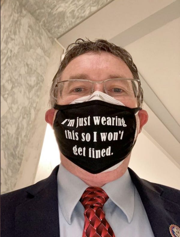 If you answered, "Congressman Dumbass is wearing a cloth mask over his N95 mask, so clearly he's a lot more worried about catching the new, more contagious variant of coronavirus than getting dinged by mean Speaker Pelosi," then please award yourself this Friday's NO PRIZE.