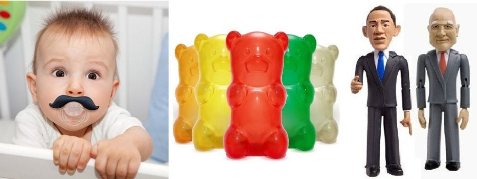 Feinberg's main stock in trade is fun items -- dare we say "whimsical"? -- like The Mustachifier: a pacifier that gives your little babby a mustache so he looks like a proper gentleman, orGummy Bear night lights.He's also done some fun goofy action figures, like the Obama doll (we're guessing the McCain dolls didn't sell as well) and sets of other action figures, like "writers"or"artists" -- the kind of stuff you'd find in a nerdy gift shop.