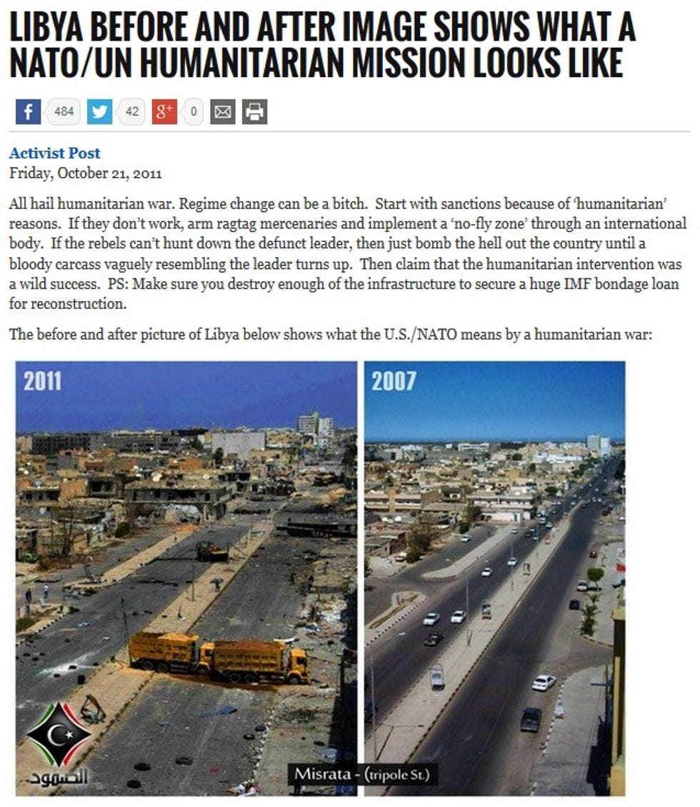 Dew started with a condemnation of 2011's "humanitarian mission to Libya," and put a 2011 Infowars article up on the screen, saying, "Here's what a 'NATO/UN humanitarian mission' looks like" -- before and after shots of a highway in Misrata that had been bombed: