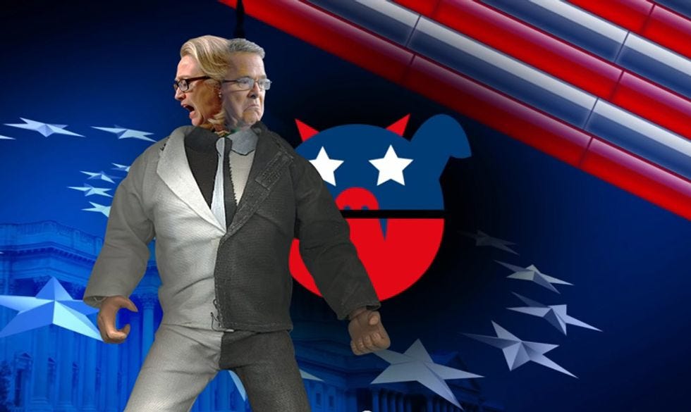We bet there's almost certainly a huge market for that. Jones summed up, in his inimitable commonsense style: "We need a bobblehead that actually wants to live in a free country, not celebrate some lying CIA SCUMBAG WITCH!" Jones then told Dew he could go back to his "softball interview" with Feinberg, and Dew made some lame suggestions about how maybe a two-headed dragon toy could represent the "left/right paradigm," which of course is an illusion because the people who really run things give us only the illusion of political choices between the "legions of the Bush and the Clinton crime families" -- all while Jones, unable to stay away from the mic, chanted "Vince Foster travelgate Whitewater." Sadly, for all his polite smiling and nodding, Jason Feinberg isn't all that excited about marketing a left-right paradigm doll with head-flipping action.