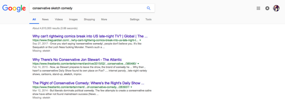 Do you know that if you search for "Conservative sketch comedy" on Google, pretty much all you get is a list of articles on why conservatives are not funny?
