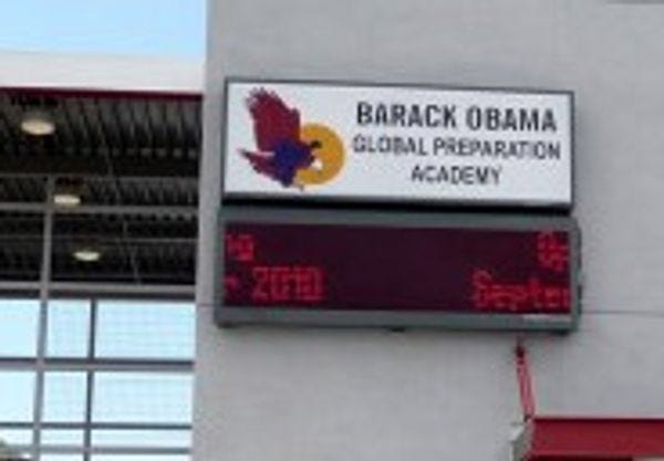 Just because he is black doesn't make him worthy of naming a school after him when he hasn't had any great accomplishments other than trying to fulfill pushing his dream of a socialist state. He hasn't even finished a term yet.
