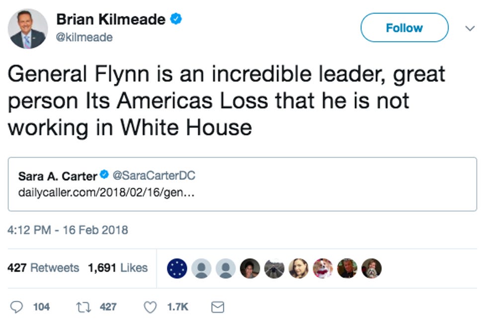 What is Fox & Friends's Brian Kilmeade babbling about now? No one seriously thinks Mike Flynn is innocent! The Mueller investigation would be over already if they could just get through deposing Flynn about his one million crimes.