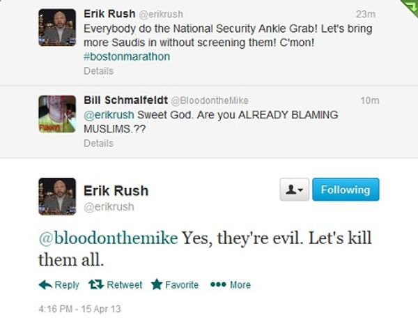 You know what is apparently hard to understand? Conservative "sarcasm." Hilarious, poorly timed, weak ass sarcasm, especially when it isn't. As Boston was being terrorized and Dok Zoom was live blogging for us all on Monday, the social networks were ablaze with heartbroken exclamations of horror, shock, grief and sadness, and because this is America - bigoted, xenophobic outbursts and calls for more murder out the ying-yang. Of the many terribly wrong twerkers was one Erik Rush of WND and his masterful tweets of doom upon the entire Muslim population - and now the obligatory "he was just being sarcastic, liberals are all so stupid" and now he is getting death threats, because he made death threats and that is not funny. We here at Wonkette would like to point out that we are AGAINST DEATH THREATS, always, even death threats against those who make death threats. Oh then also he got SWATted. We are mostly against SWATting too, because of how it wastes law enforcement resources and time. Mostly.