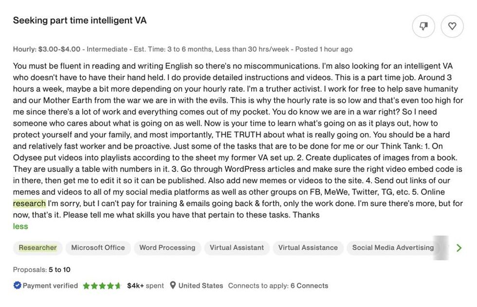 Yes, this definitely seems like a job disseminating QAnon propaganda (or something similar) for less than half of the minimum wage. What an incredible opportunity! You do know we are in a war, right?