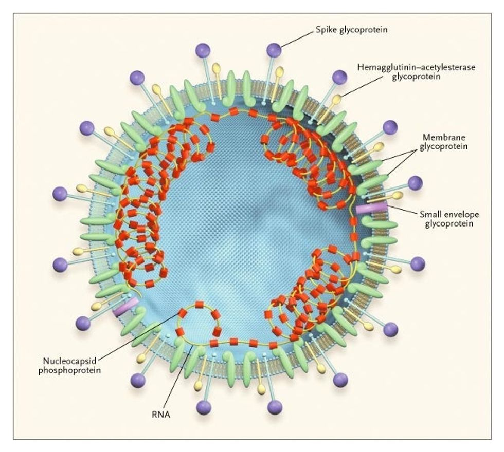 Okay, let's look at the pendejito causing all the fuss. Below is a nice mug shot of it courtesy of our friends at the New England Journal of Medicine . It's important to note here that this is a general diagram of a coronavirus, and the one floating around named severe acute respiratory syndrome coronavirus 2 or SARS-CoV-2 to its friends, which causes COVID-19 (the disease name), is a TYPE of coronavirus. Sort of like how that asshole seagull that shit on me during my run yesterday is a "bird" and there are lots of different kinds of birds. Some coronaviruses cause colds and some are used to give Corona beer that special taste. (That last part is totally true, by which we mean NOT TRUE.) Anywho, there are three main structures you need to understand about coronita , the various proteins that stick out like little crown tops (hence the moniker "corona" which means "crown" in a certain, excellent language), the RNA (just think of DNA if you don't know the difference) and the membrane, which isn't labeled in the diagram, but is that circular wall-like structure.
