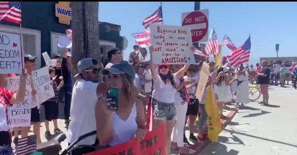 Hundreds of people flocked to the San Diego neighborhood of Pacific Beach, California, this weekend to protest their own continued existence. They defied the state's ongoing stay-at-home order and demanded that businesses reopen, so people could risk their lives serving them beer and cheese fries. Remember when conservatives suggested that black people shouldn't wear hoodies if they wanted to avoid getting shot? That was just helpful, life-saving fashion advice. Governor Gavin Newsom's perfectly legal executive order, however, is flat-out tyranny.