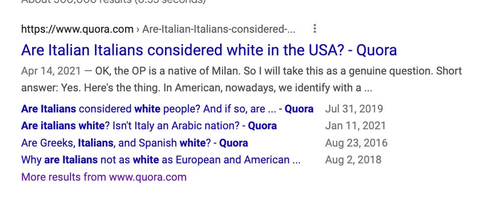 There are also people who will insist forever that Italian-Americans "weren't always white." There are people who believe that Sicilian people and Southern Italians are part Black due to proximity to Africa (there is a very racist saying about this which I will not repeat).