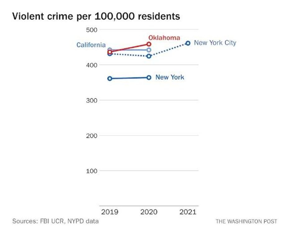 Just to be scrupulously accurate, we'll note that, in a separate fact check, Oklahoma TV station KFOR, using FBI crime statistics, noted that Oklahoma had higher violent crime than New York and California in 2020, but that in 2019, the first year of Stitt's term, Oklahoma had "higher crime than New York, but not California." Going a bit further still, WaPo's Phili Bump notes that between 2019 and 2020, violent crime rates in Oklahoma actually increased more than either New York or California. Oh look, it's a chart!