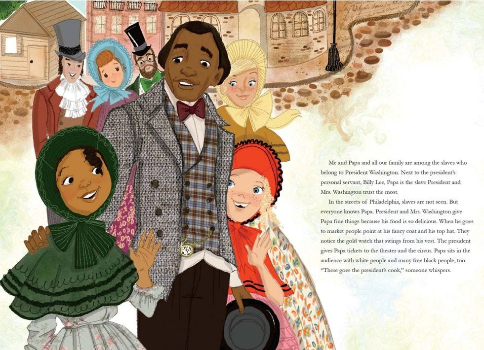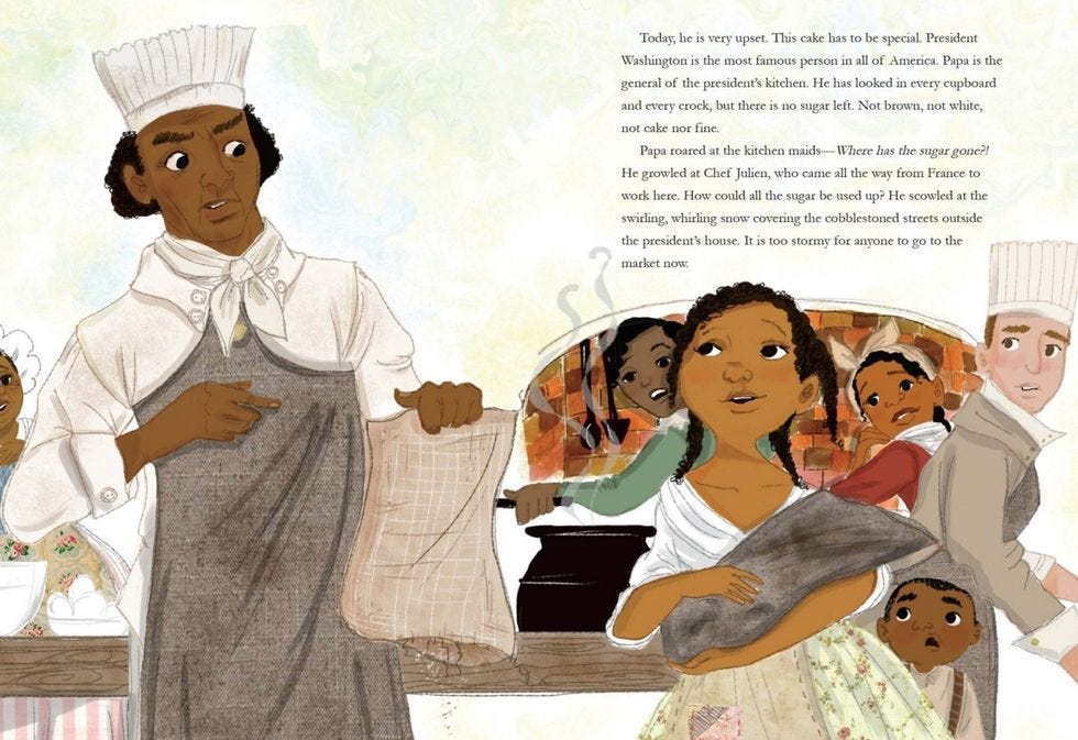 Hmmm. That would present a bit of a challenge to illustrate in a cheerful story about baking a birthday cake. We also learn that, after being sent back to Mount Vernon when Washington suspected Hercules and his son of stealing money to buy their freedom, Hercules eventually did run away for good in 1797. And on Washington's birthday no less, the cake-baking ingrate. His daughter Delia -- who in reality never lived in the Philadelphia house -- remained in slavery for the rest of her life, because she belonged to Martha, who, unlike George, never freed her slaves. Delia, you don't have quite so much to smile about.