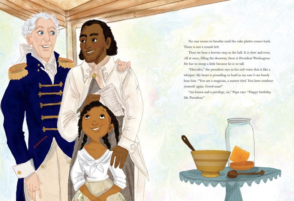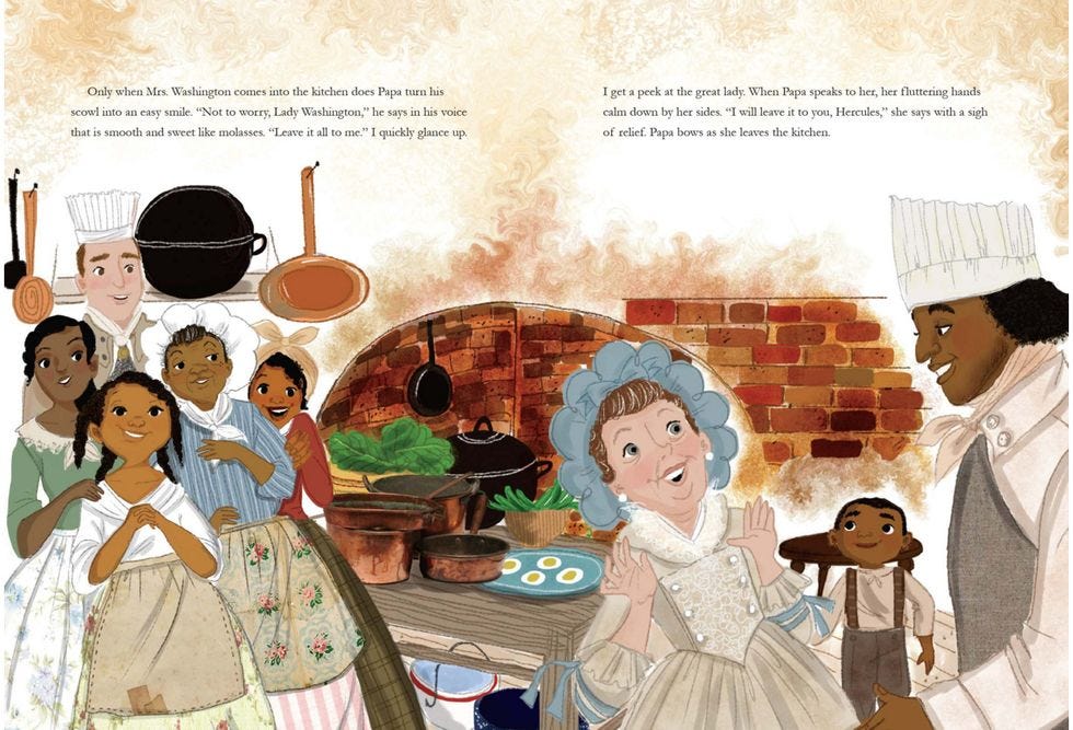 Now, it's not like the author, Ramin Ganeshram, is utterly clueless about what slavery was, and in fact the full-page author's note at the end of the book suggests she may have been aiming for a more realistic, nuanced story. She notes that Hercules was, through his connection with Washington, pretty much America's first "celebrity chef," and that he "insisted on perfection in the kitchen and was known to have a temper with those who did not obey." Ganeshram also acknowledges that while Hercules "lived a life of near-freedom ... being almost free is not the same as being free, and he dreamed of his own liberty."