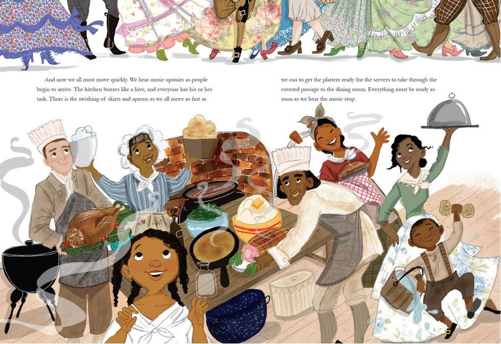 And good god, it's a painful dog's breakfast of a book; the kindest thing that can be said of it is "Bless their hearts, they meant well." We can see the appeal of the idea: depict Hercules, a master chef and absolute ruler of "his" kitchen, as a strong, competent man who's looked up to by his daughter Delia and everyone else in the kitchen of Washington's Philadelphia home. Unfortunately, it falls all too completely to the temptation of finding inspiring stories within a national tragedy. Despite the horrible injustice of slavery, Hercules nevertheless carves out for himself a space in which he is the unquestioned expert -- he even bosses around a white dude, "Chef Julien, who came all the way from France to work here." And right there, the book dances straight past the problem: Hercules doesn't own this kitchen, or even his own body. And if Julien wants to leave, he'll get a letter of recommendation, not 20 lashes with a bullwhip.