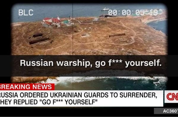 13 Ukrainian border guards on a Black Sea outpost called Snake Island were killed Thursday after they refused to surrender to a Russian Navy vessel demanding they lay their arms. But first, they gave the world an iconic moment of defiance that seems likely to be remembered in all historic accounts of Russia's invasion of Ukraine. Here's a video that includes a recording of the radio transmissions, which has been confirmed as authentic by the Ukrainian government: